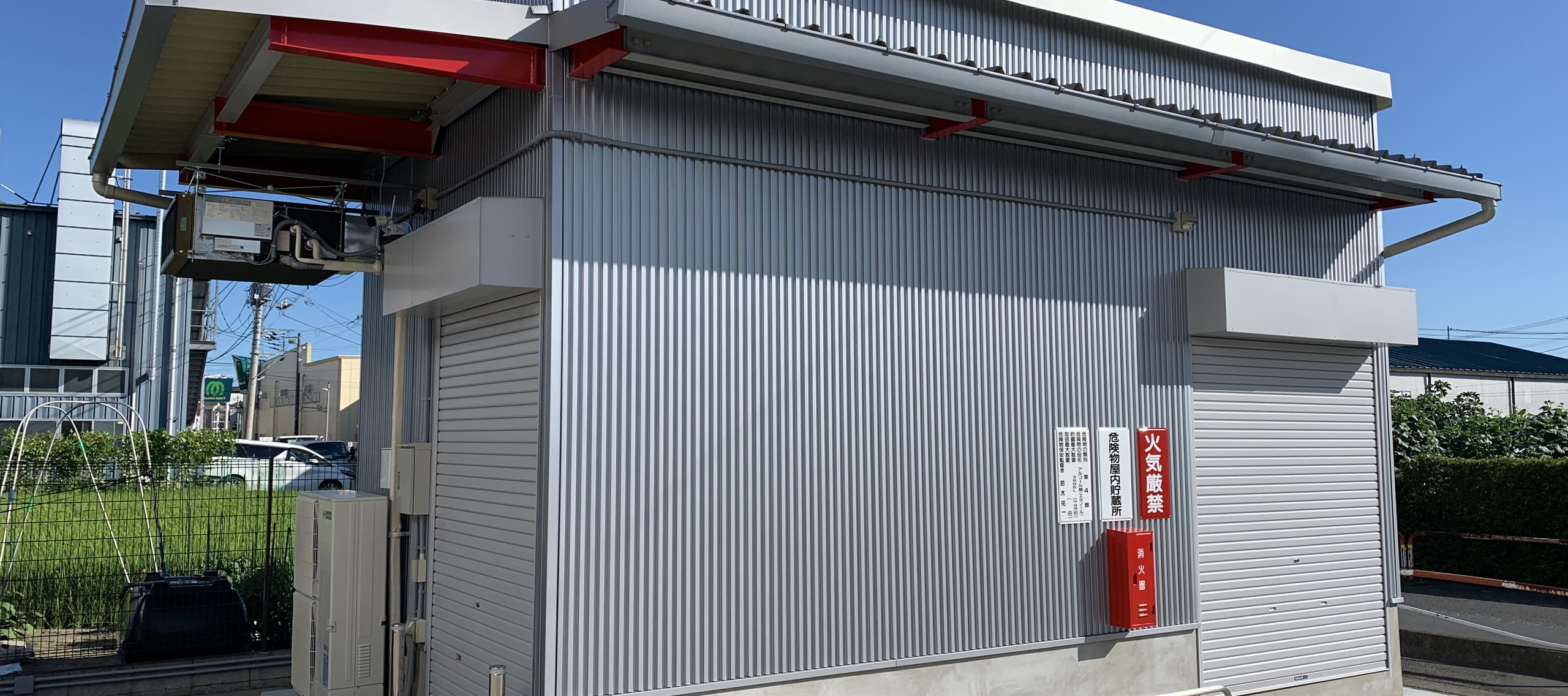 危険物保管用の設備には、保管量により「少量危険物取扱所」と「危険物貯蔵取扱所」の2種類があり、「少量危険物取扱所」では指定数量の1/5以上~指定数量以下まで保管可能です。