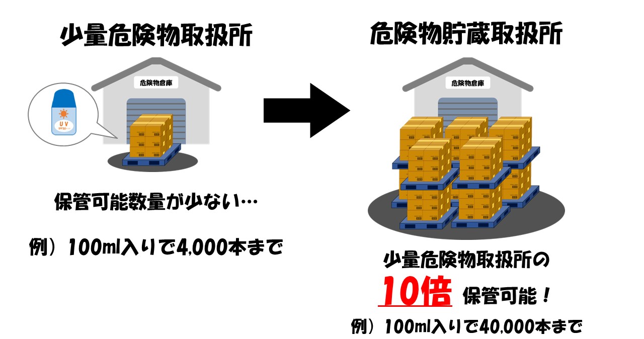 当社の「危険物倉庫」は「危険物貯蔵取扱所」に該当し、指定数量の10倍まで保管可能ですので多くの量の保管が可能です。